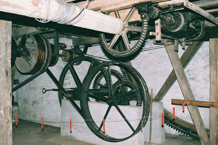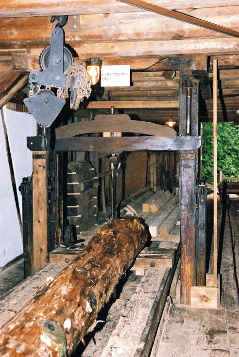 Fabrikant Gebrüder Hartmann, Flums Jahrgang ca. 1900 Sägeblattzahl 1 Hub 520 mm Hubzahl 150 – 160/min Durchlass grösste Stammdicke 1.15 m Stammlänge 8.5 m